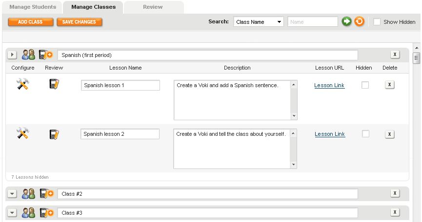 Manage Classes & Assignments. Voki Classroom lets you add and manage your Classes, as well as Aassignments within each class. When you add a new class, a new row will appear (see below). You can then name your Class – i.e. “Spanish (first period)” and add Assignments to it.