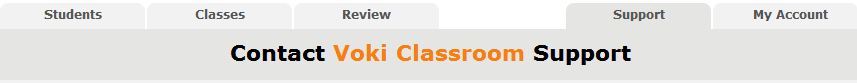 As a Voki Classroom user, you are able to get unlimited e-mail support from our dedicated support team (only available to Voki Classroom users). First you need to log onto Voki Classroom using your personal teacher account, and then, with Voki Classroom open, select the support tab. Second, choose your topic, enter your question, and submit! One of our support representatives will get back to you promptly with an answer!