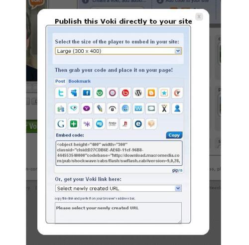 2. This is not the window that opens when I select Publish on my Voki. I’m not given an embedding code, just a URL Link. I would like it to appear on my student’s blog, not a link in a post.