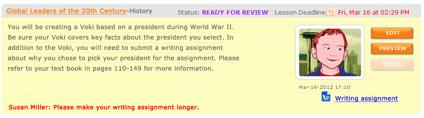 Voki Classroom is constantly improving thanks to your feedback! In this update, we would like to introduce the newest Voki Classroom features. Starting this week, teachers will be able to add a writing assignment to their Voki assignments, set Assignment deadlines, show/hide student names in the Assignment Pages, and give students feedback. Status types have also been updated in both the teacher and student accounts. Read below for more information!