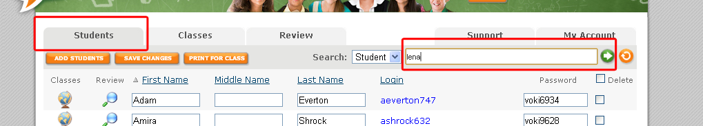 First, click on your Students tab and type in your student’s name. Then hit enter or the green arrow button.