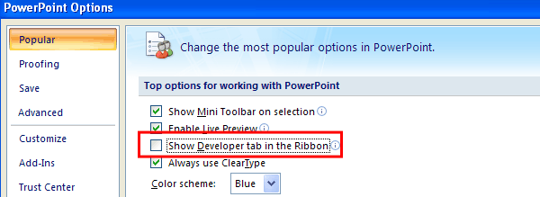 - Make sure that the option for Show Developer tab in the Ribbon is checked. If not, click on it and click OK. The Developer tab will be added to your Ribbon.