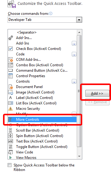 8. Locate and click on More Controls and click Add. It will appear on the top menu.